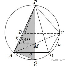 Второй способ. Пусть ABCDP — данная правильная четырёхугольная пирамида с вершиной P, AB = BC = CD = AD = a, M — центр квадрата ABCD, K — середина отрезка AB.