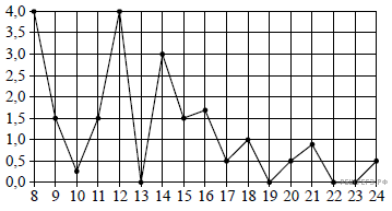 Версия для печати и копирования в MS WordНа рисунке жирными точками показано суточное количество осадков, выпадавших в Томске с 8 по 24 января 2005 года. По горизонтали указываются числа месяца, по вертикали — количество осадков, выпавших в соответствующий день, в миллиметрах. Для наглядности жирные точки на рисунке соединены линией. Определите по рисунку, какого числа в Томске впервые выпало ровно 1,5 миллиметра осадков.