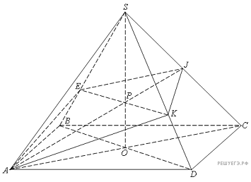 Итак, ребро SC пирамиды перпендикулярно к двум пересекающимся прямым АТ и KT, лежащим в плоскости построенного четырехугольника AETK. Значит, эта плоскость перпендикулярна ребру SC. Из перпендикулярности SC и (ETK) следует, что В таком случае KT = ET как проекции равных наклонных SK и SE к (ETK),