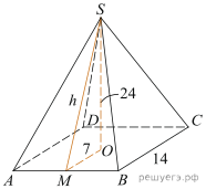 Найдите площадь боковой поверхности правильной четырехугольной пирамиды, сторона основания которой равна 14 и высота равна 24.