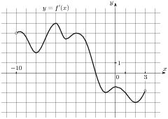 На рисунке изображен график производной функции f(x), определенной на интервале (−8; 4). В какой точке отрезка [−7; −3] f(x) принимает наименьшее значение?