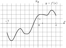 На рисунке изображен график производной функции f(x), определенной на интервале (−8; 4). В какой точке отрезка [−7; −3] f(x) принимает наименьшее значение?