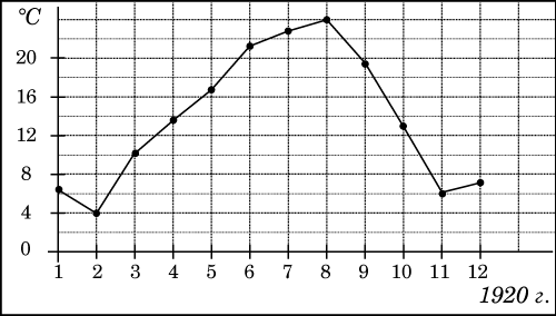На рисунке жирными точками показана среднемесячная температура воздуха в Сочи за каждый месяц 1920 года. По горизонтали указываются месяцы, по вертикали - температура в градусах Цельсия. Для наглядности жирные точки соединены линией. Определите по рисунку наименьшую среднемесячную температуру в период с мая по декабрь 1920 года. Ответ дайте в градусах Цельсия.