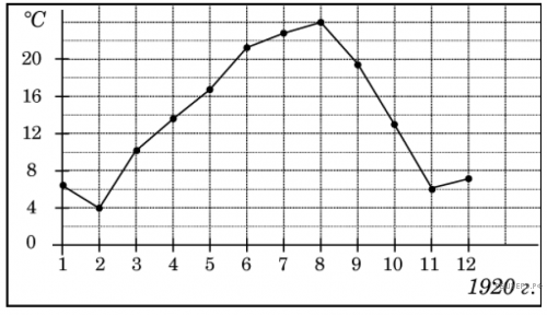 На рисунке жирными точками показана среднемесячная температура воздуха за каждый месяц 1920 года. По горизонтали указываются месяцы, по вертикали — температура в градусах Цельсия. Для наглядности жирные точки соединены линией. Определите по рисунку разность между наибольшей и наименьшей среднемесячными температурами за указанный период. Ответ дайте в градусах Цельсия.