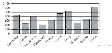 На диаграмме показано распределение выплавки меди в 10 странах мира (в тысячах тонн) за 2006 год. Среди представленных стран первое место по выплавке меди занимали США, десятое место — Казахстан. Какое место занимала Австралия?