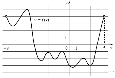 На рисунке изображён график функции y = f (x), определённой на интервале (−9; 5). Найдите количество точек, в которых производная функции f (x) равна 0.