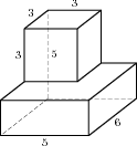 Площадь поверхности заданного многогранника равна сумме площадей параллелепипедов со сторонами 2, 3, 3 и 5, 4, 3, уменьшенной на удвоенную площадь прямоугольника со сторонами 3, 2: