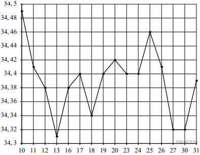 На рисунке жирными точками показан курс евро, установленный Центробанком РФ, во все рабочие дни в январе 2006 года. По горизонтали указываются числа месяца, по вертикали — цена евро в рублях. Для наглядности жирные точки на рисунке соединены линией. Определите по рисунку, сколько рабочих дней из данного периода курс евро был больше 34,37 рубля.