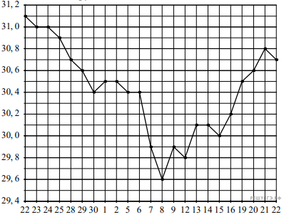 На рисунке жирными точками показан курс доллара, установленный Центробанком РФ, во все рабочие дни с 22 сентября по 22 октября 2009 года. По горизонтали указываются числа месяца, по вертикали — цена доллара в рублях. Для наглядности жирные точки на рисунке соединены линией. Определите по рисунку, сколько рабочих дней из данного периода курс доллара был больше 30,3 рубля.
