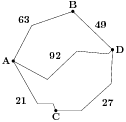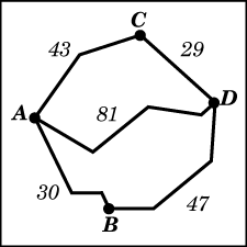 Из пункта А в пункт D ведут три дороги. Через пункт В едет грузовик со средней скоростью 40 км/ч, через пункт С едет автобус со средней скоростью 49 км/ч. Третья дорога — без промежуточных пунктов, и по ней движется легковой автомобиль со средней скоростью 52 км/ч. На рисунке показана схема дорог и расстояние между пунктами по дорогам.