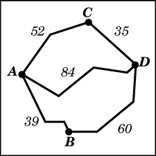 Из пункта A в пункт D ведут три дороги. Через пункт B едет грузовик со средней скоростью 52 км/ч, через пункт C едет автобус со средней скоростью 36 км/ч. Третья дорога — без промежуточных пунктов, и по ней движется легковой автомобиль со средней скоростью 60 км/ч. На рисунке показана схема дорог и расстояние между пунктами по дорогам.