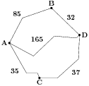 Из пункта А в пункт D ведут три дороги. Через пункт В едет грузовик со средней скоростью 36 км/ч, через пункт С едет автобус со средней скоростью 48 км/ч. Третья дорога — без промежуточных пунктов, и по ней движется легковой автомобиль со средней скоростью 62 км/ч. На рисунке показана схема дорог и расстояние между пунктами по дорогам.