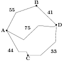 Из пункта A в пункт D ведут три дороги. Через пункт B едет грузовик со средней скоростью 60 км/ч, через пункт C едет автобус со средней скоростью 44 км/ч. Третья дорога — без промежуточных пунктов, и по ней движется легковой автомобиль со средней скоростью 48 км/ч. На рисунке показана схема дорог и расстояние между пунктами по дорогам.