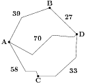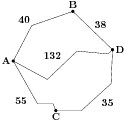 Из пункта A в пункт D ведут три дороги. Через пункт B едет грузовик со средней скоростью 60 км/ч, через пункт C едет автобус со средней скоростью 38 км/ч. Третья дорога — без промежуточных пунктов, и по ней движется легковой автомобиль со средней скоростью 58 км/ч. На рисунке показана схема дорог и расстояние между пунктами по дорогам.