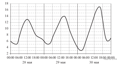 На рисунке показано изменение температуры воздуха на протяжении трех суток. По горизонтали указывается дата и время суток, по вертикали — значение температуры в градусах Цельсия. Определите по рисунку наибольшую температуру воздуха 29 мая. Ответ дайте в градусах Цельсия.