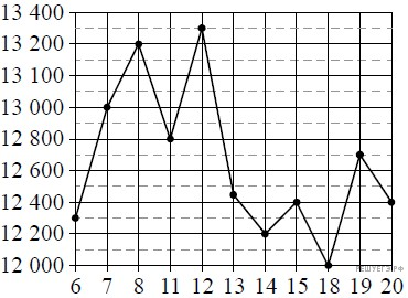 На рисунке жирными точками показана цена олова на момент закрытия биржевых торгов во все рабочие дни с 3 по 18 сентября 2007 года. По горизонтали указываются числа месяца, по вертикали — цена тонны олова в долларах США. Для наглядности жирные точки на рисунке соединены линией. Определите по рисунку наибольшую цену олова на момент закрытия торгов в указанный период (в долларах США за тонну).