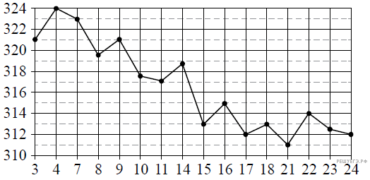 На рисунке жирными точками показана цена золота на момент закрытия биржевых торгов во все рабочие дни с 3 по 24 марта 2002 года. По горизонтали указываются числа месяца, по вертикали — цена унции золота в долларах США. Для наглядности жирные точки на рисунке соединены линией. Определите по рисунку наибольшую цену золота на момент закрытия торгов в период с 8 по 21 марта (в долларах США за унцию).