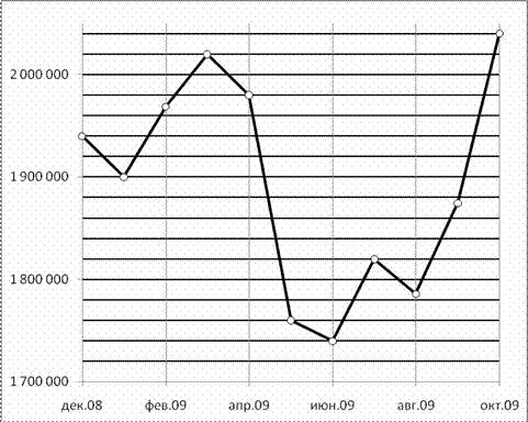 На рисунке жирными точками показана средняя недельная аудитория поискового сайта Ya.ru во все месяцы с декабря 2008 по октябрь 2009 года. По горизонтали указываются месяцы, по вертикали — количество человек, посетивших сайт хотя бы раз за неделю (среднее за 4 недели месяца). Для наглядности жирные точки на рисунке соединены линией. Определите по рисунку наибольшую среднюю недельную аудиторию за указанный период.