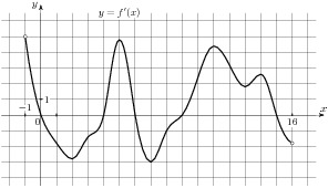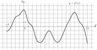 На рисунке изображён график функции — производной функции f(x), определённой на интервале (−3; 14). Найдите промежутки возрастания функции f(x). В ответе укажите длину наибольшего из них.