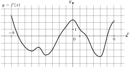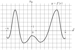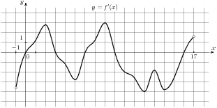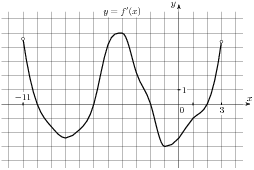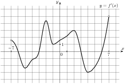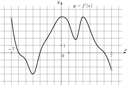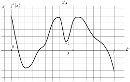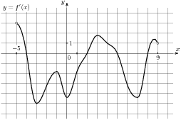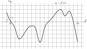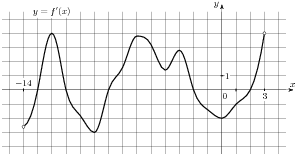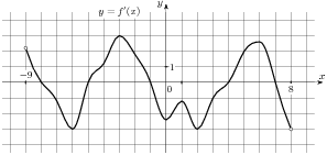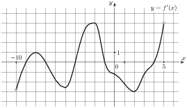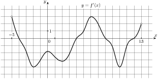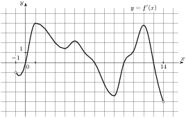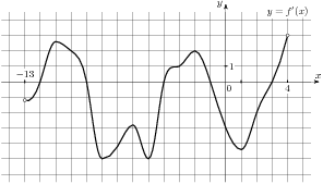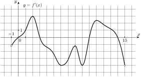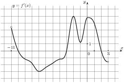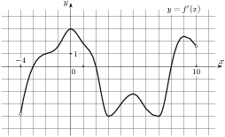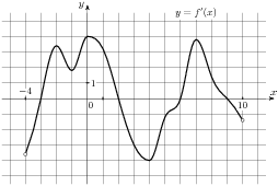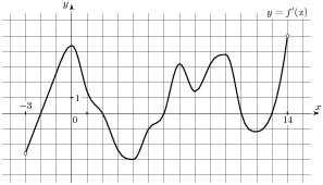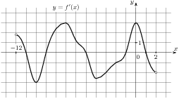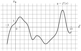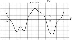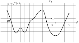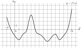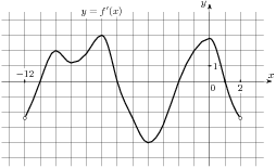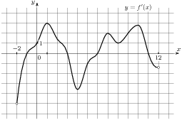 На рисунке изображен график производной функции f(x), определенной на интервале (−2; 12). Найдите промежутки убывания функции f(x). В ответе укажите длину наибольшего из них.