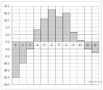 На диаграмме показана среднемесячная температура воздуха в Екатеринбурге (Свердловске) за каждый месяц 1973 года. По горизонтали указываются месяцы, по вертикали — температура в градусах Цельсия. Определите по диаграмме, на сколько градусов Цельсия март был в среднем холоднее августа.