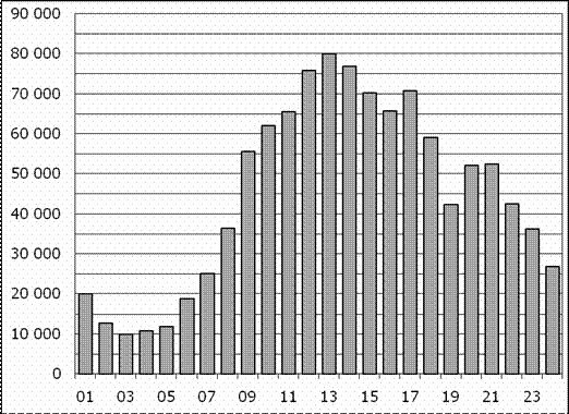 На диаграмме показано количество посетителей сайта РИА Новости в течение каждого часа 8 декабря 2009 года. По горизонтали указывается номер часа, по вертикали — количество посетителей сайта за данный час. Определите по диаграмме, сколько было часов в данный день, когда на сайте РИА Новости было более 50 000 посетителей.