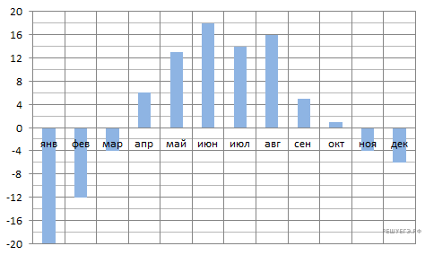 На диаграмме показана среднемесячная температура в Нижнем Новгороде (Горьком) за каждый месяц 1994 года. По горизонтали указываются месяцы, по вертикали — температура в градусах Цельсия. Определите по диаграмме наименьшую среднемесячную температуру в 1994 году. Ответ дайте в градусах Цельсия.